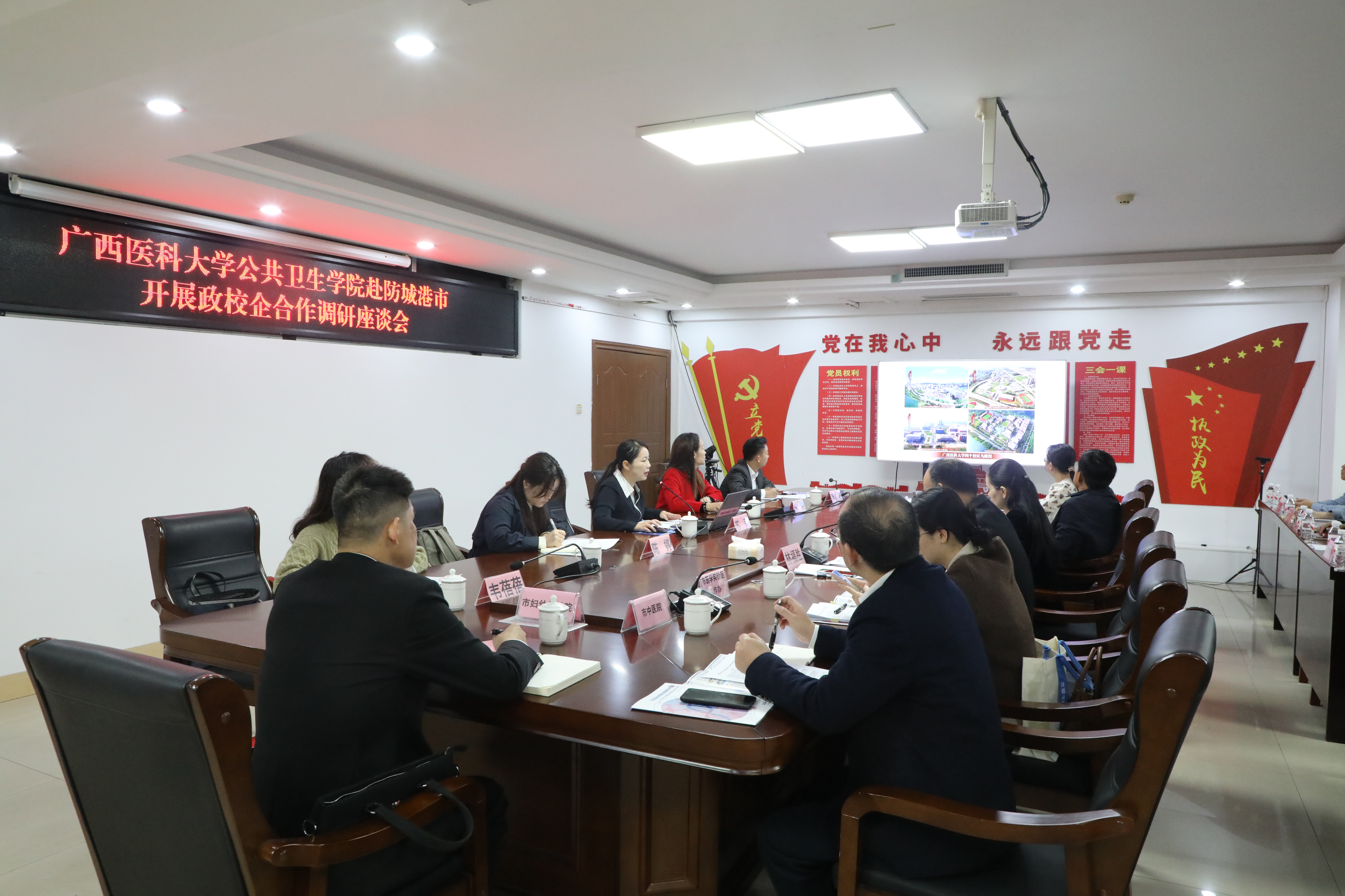 座谈会上,苏莉从团队建设、人才培养等方面介绍了公司整体情况,重点推介了公司员工的培养质量与就业潜力,表达了向当地输送优质公共卫生专业人才的积极意愿。防城港市人社局局长严念结合当地区位优势,系统介绍了市政校企合作进展与公共卫生人才队伍建设现状,提出“共建平台、共商机制、共推发展”的合作倡议,明确深化合作方向。随后,各参会单位负责人分别围绕本单位建设情况、人才需求及培养建议等方面进行交流发言,与公司就毕业生输送、实习实践基地建设等后续合作方向初步达成共识。
